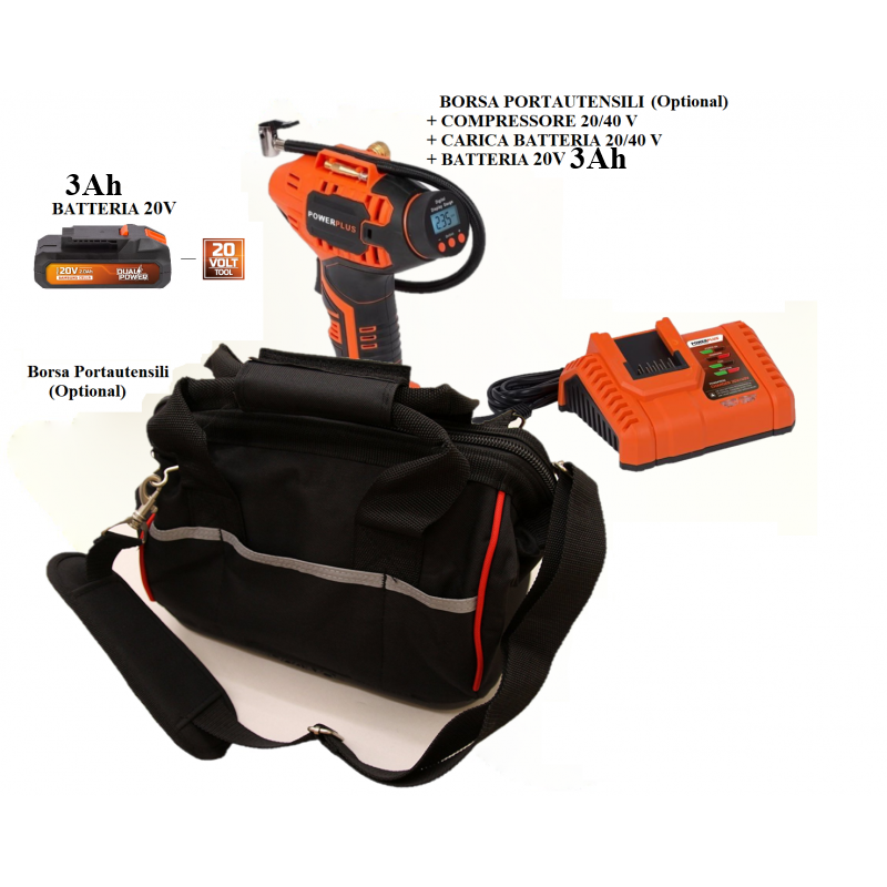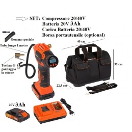 COMPRESSORE PORTATILE 20/40V DUAL POWER + BORSA PORTA ELETTROUTENSILI COD.POWDP7020 CON MANOMETRO DIGITALE CON CARICA BATTERIA VELOCE/BATTERIA LITIO 2,0Ah Con tubo flex da 1metro con testina di gonfiaggio Portata aria: 30 litri aria /minuto